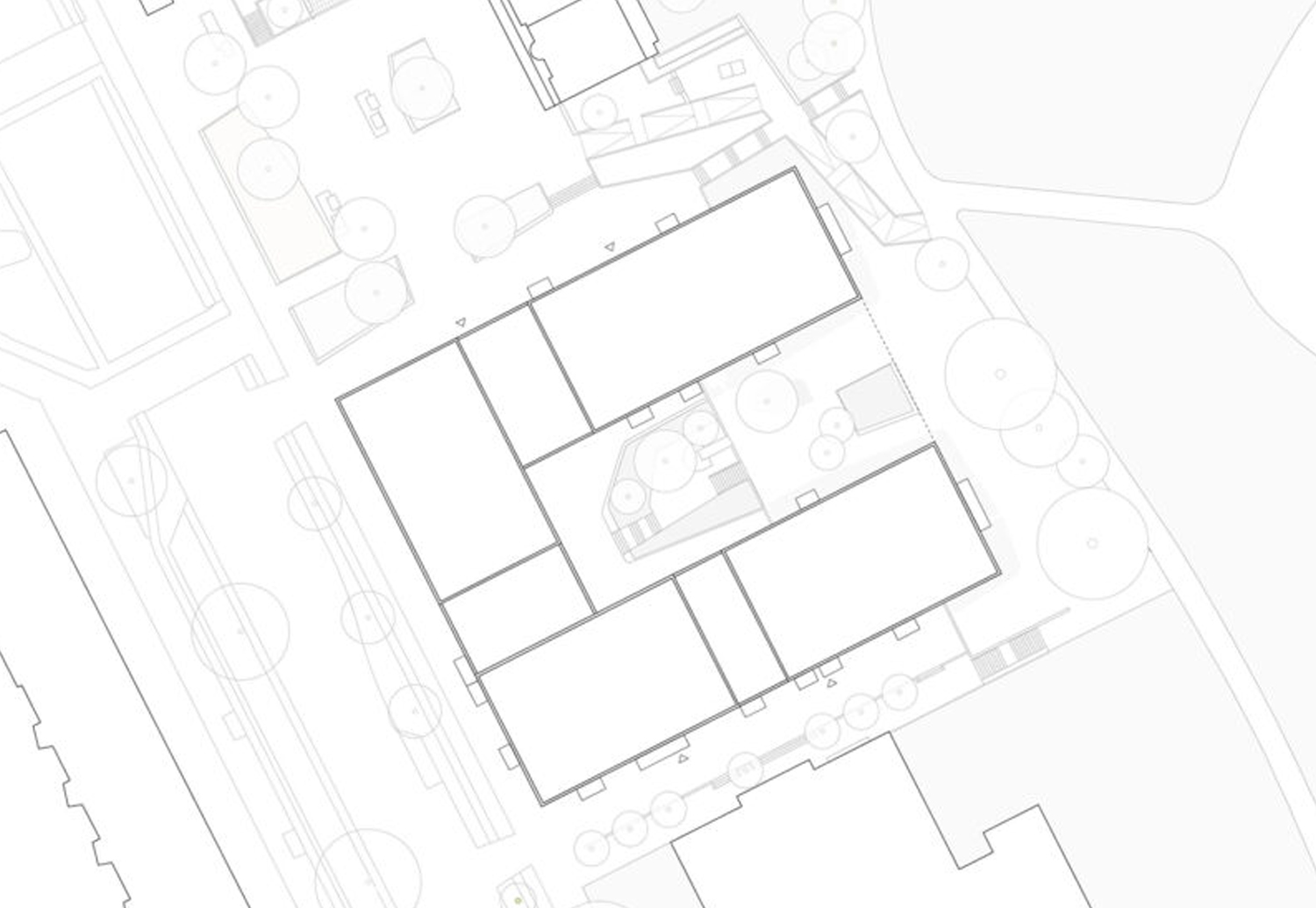 Die Gründung erfolgt über eine gebettete Stahlbetonbodenplatte. Aufgrund vorhandener Auffüllungen war ein Bodenaustausch erforderlich, um die notwendigen Tragfähigkeiten sicherzustellen. Unterschiedliche Gebäudeteile mit variierender Höhe wurden konstruktiv so ausgebildet, dass Setzungsunterschiede minimiert werden.