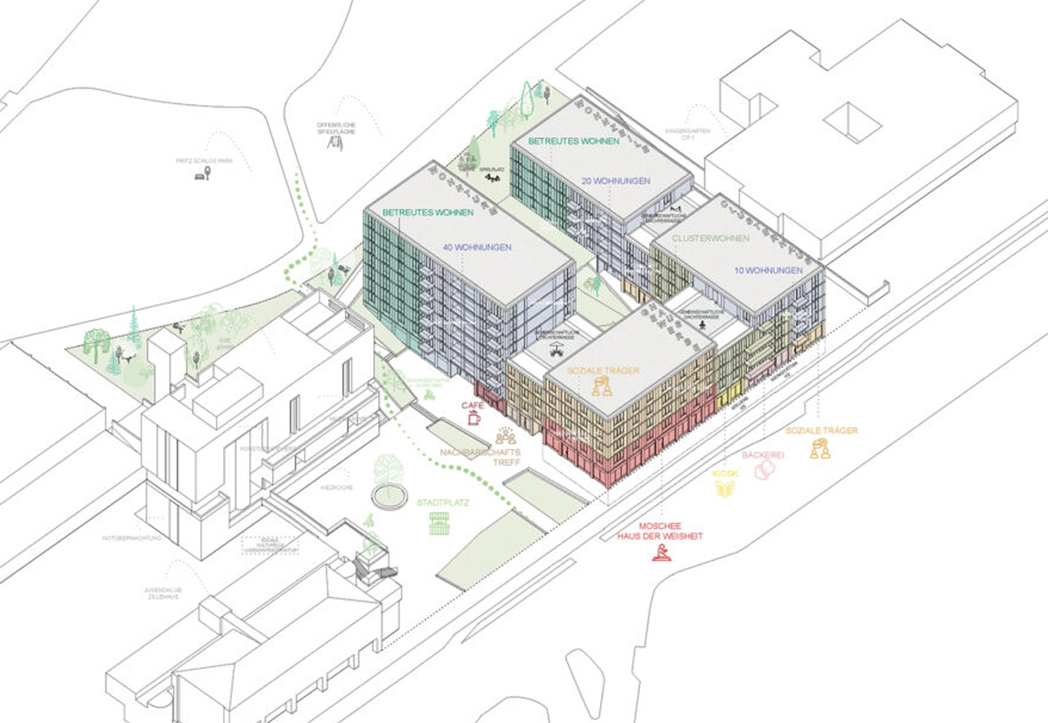 In Berlin-Moabit entstand zwischen Rathenower Straße und Fritz-Schloß-Park ein Wohn- und Geschäftsbau mit insgesamt 91 Wohnungen und 25 Gewerbeeinheiten. Der Gebäudekomplex ist als hybrider Block mit vier unterschiedlichen Baukörpern – Wohnturm, Gewerbehaus, Clusterhaus und Wohnzeile – ausgebildet, die sich um einen privaten Innenhof gruppieren. Die Höhenentwicklung variiert zwischen vier und acht Geschossen. Eine ansteigende Hofebene bindet das Grundstück direkt an den angrenzenden Park an.