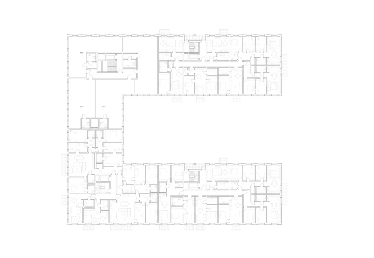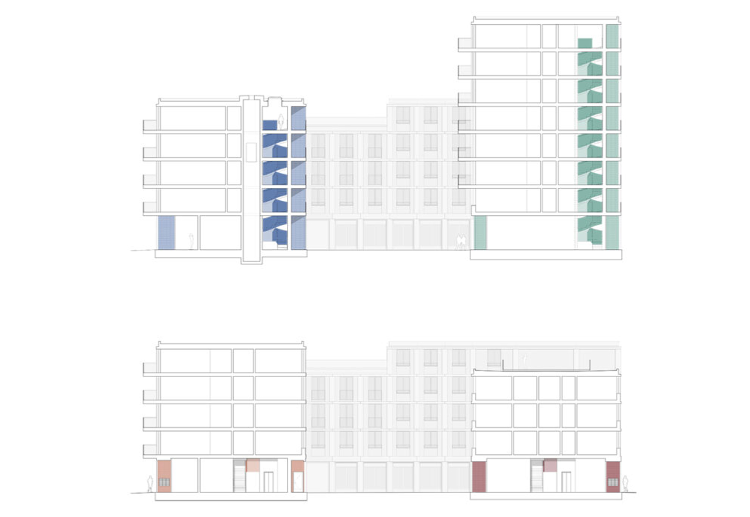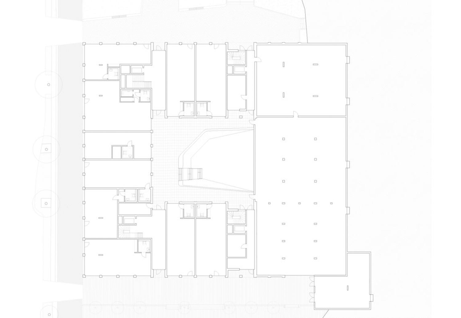 Besondere Anforderungen ergaben sich aus der Integration einer Parkgarage im Gebäudekomplex. Um die erforderlichen Spannweiten und Durchfahrtsbreiten zu gewährleisten, wurden einzelne Stützen aus den Obergeschossen über Unterzüge abgefangen. Auch im Bereich der Fassaden wurden Stützen gezielt reduziert, um großzügige und offene Erdgeschosszonen zu ermöglichen.