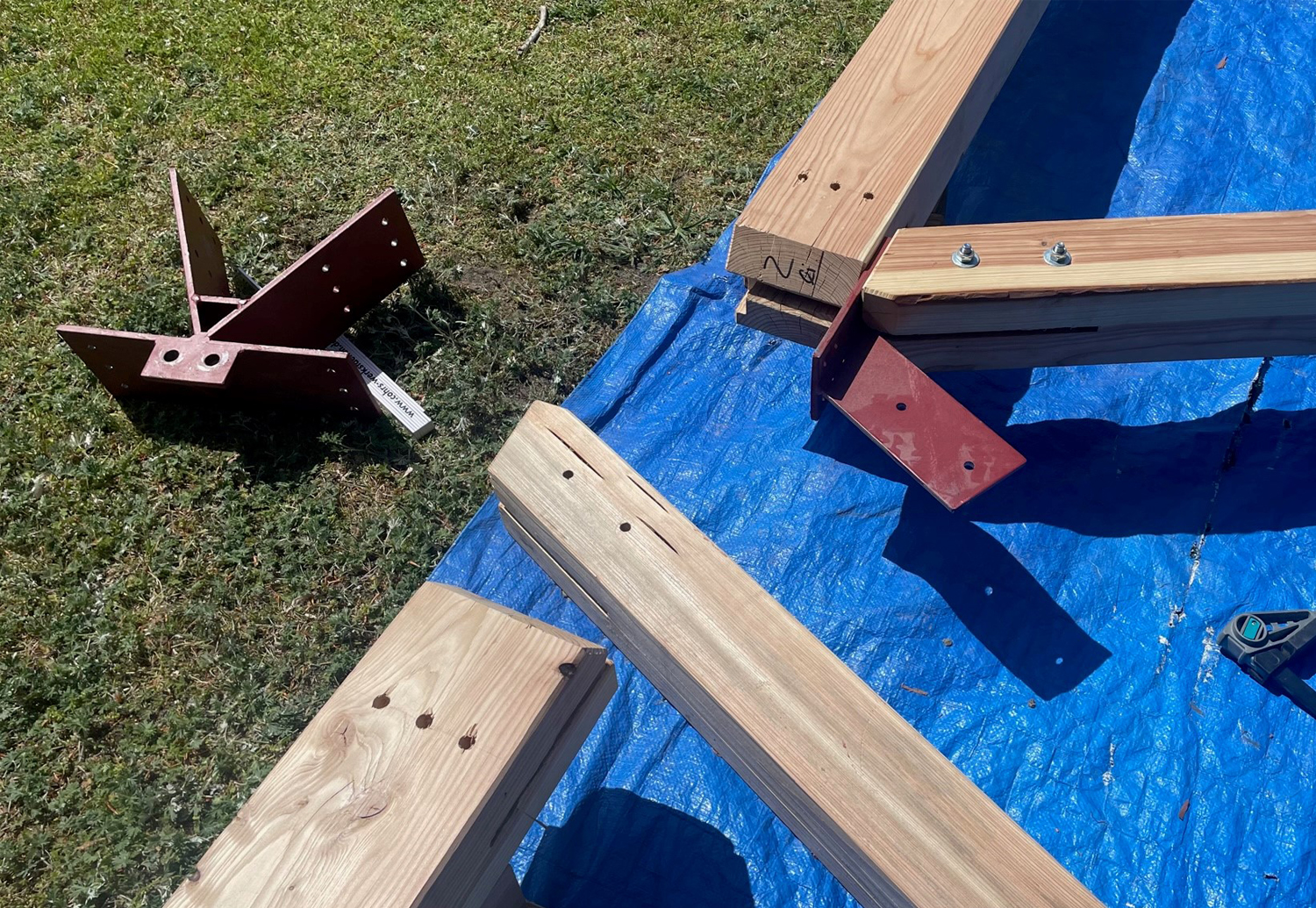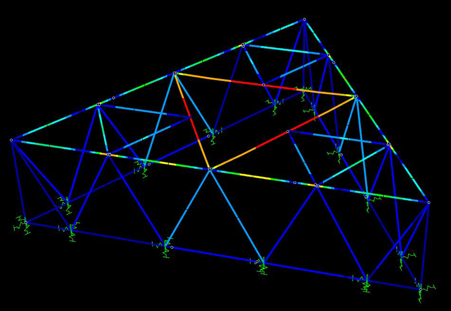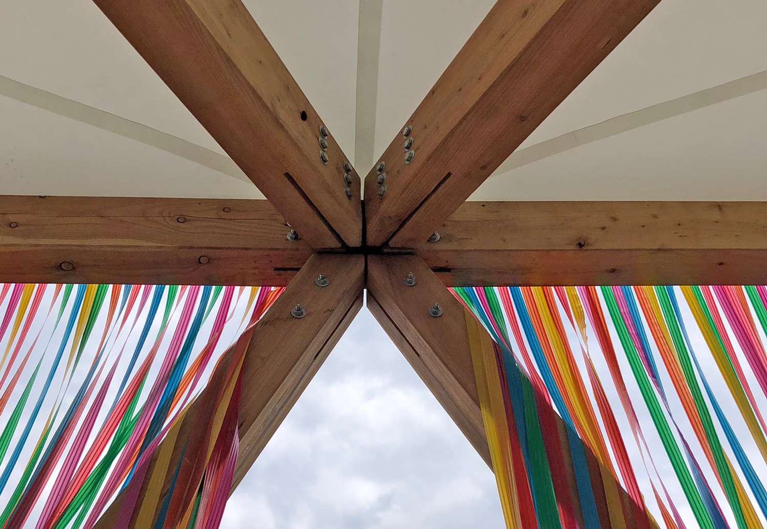Die Tragstruktur besteht aus einer Holzkonstruktion mit zwei Ebenen. In der Dachebene spannt ein Gitterrost aus Rand-, Haupt- und Nebenträgern, der von schräg gestellten Fachwerkstützen getragen wird. Die Stützen sind gelenkig angeschlossen und auf Schraubfundamenten gegründet. Durch diese Art der Gründung werden Eingriffe in den Baugrund auf ein Minimum reduziert und ein rückstandsloser Abbau ermöglicht.