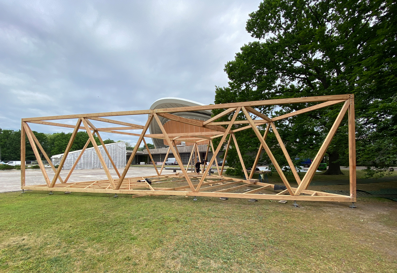 Für das Haus der Kulturen der Welt in Berlin wurde in dessen unmittelbarer Nähe im Tiergarten ein temporärer Pavillon realisiert. Als Auftakt einer Reihe jährlich wechselnder Bauwerke versteht sich die Installation als offener Ort für Begegnung, Austausch und Veranstaltungen im öffentlichen Raum. Der Pavillon ist auf eine Nutzungsdauer von einer Sommersaison ausgelegt und so konzipiert, dass er vollständig zurückgebaut und an anderer Stelle wieder aufgebaut werden kann.
